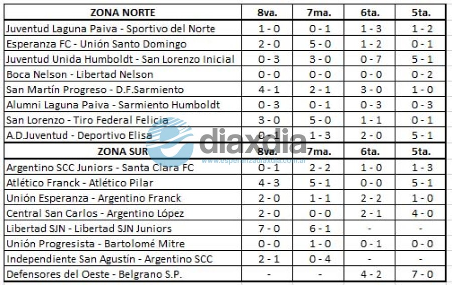 En la Zona Norte lidera Esperanza FC con 37 puntos, seguido de Juventud Unida de Humboldt con 32 y Deportivo Elisa con 30 unidades y hasta allí aseguraron su clasificación. Sportivo del Norte con 29 unidades y San Lorenzo Inicial con 23 tienen siguen en las posiciones con expectativas.