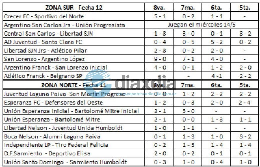 Octava División – Zona Sur: Libertad SJN 31; Argentino San Carlos 26; Atlético Pilar y San Lorenzo 24; Atlético Franck 21 y Central San Carlos y Crecer FC 18.