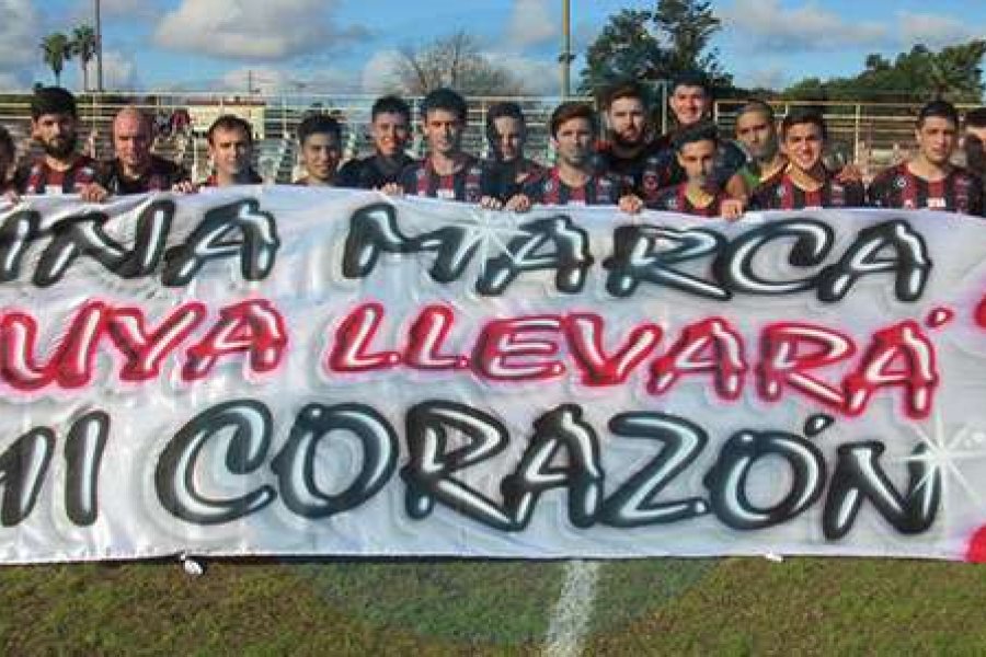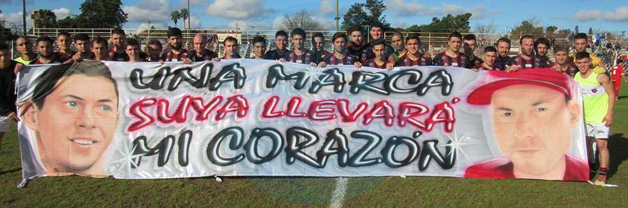 La bandera dice "Una marca suya llevará mi corazón" y los rostros de los dos futbolistas que pasaron por San Martín de Progreso y fallecieron durante este año.