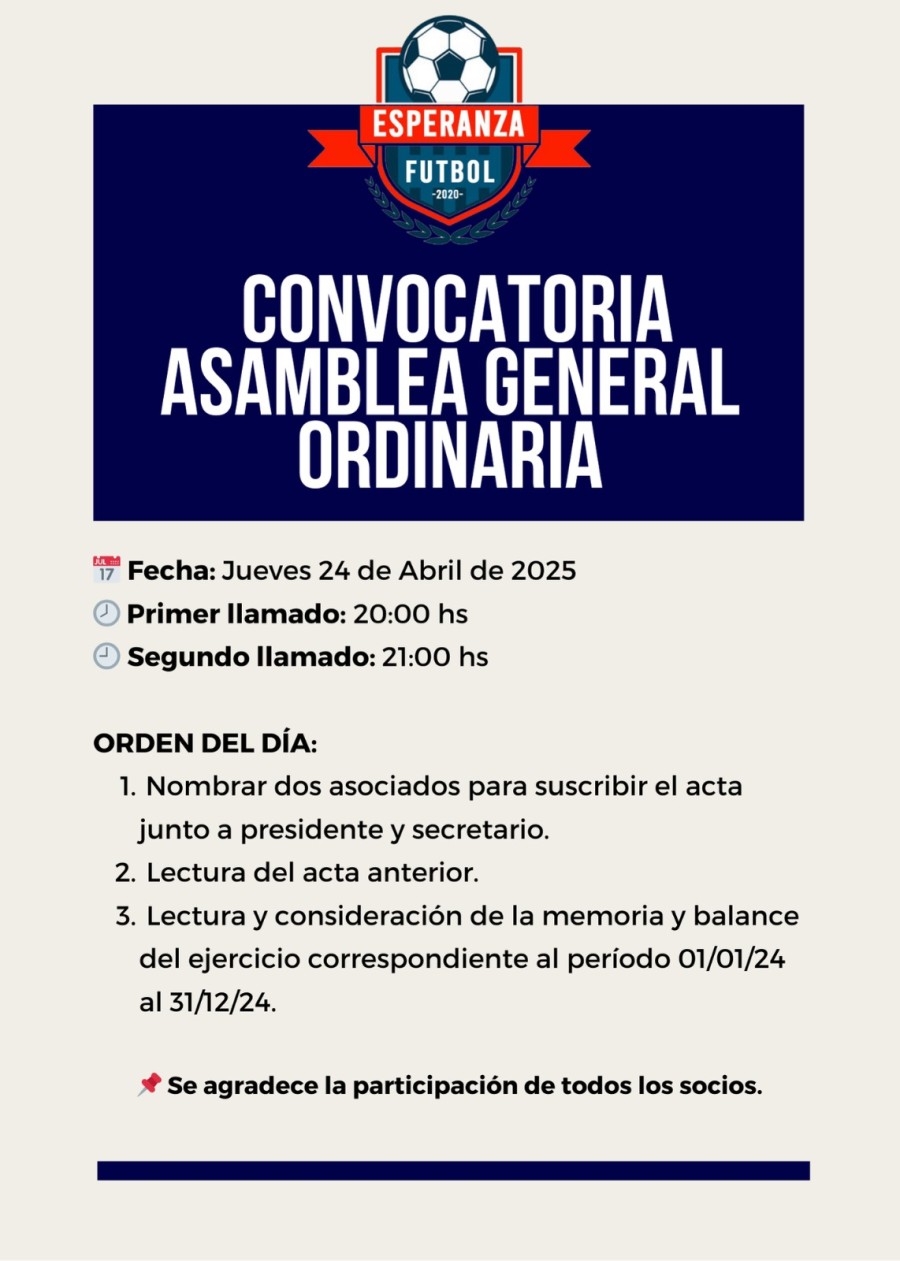 El Club Esperanza Fútbol de nuestra ciudad, convoca a la asamble general ordinaria para el jueves 24 de abril a las 20 horas con el primer llamado y 21 hs para el segundo llamado con el siguiente orden del día.