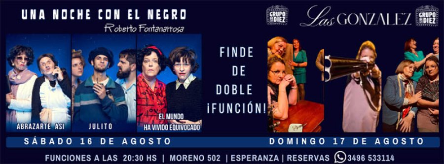 20.30 h: Teatro: «Las González», una comedia de Hugo L. Saccoccia. A cargo de «Grupo de los Diez». Reservas al 3496533114. En La Juana Sala Cultural Independiente. Moreno 502.