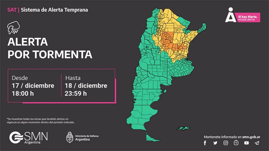 El área será afectada por tormentas, algunas localmente fuertes o severas. Las mismas estarán acompañadas por actividad eléctrica muy intensa, ocasional caída de granizo de diversos tamaños, y, principalmente, abundante caída de agua en cortos períodos. No se descartan ráfagas fuertes de manera localizada.