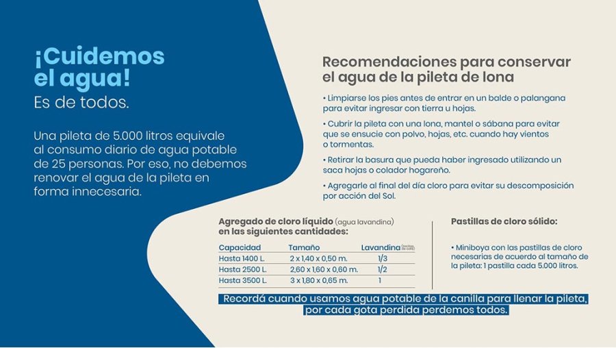 > Agregar al agua de la pileta hipoclorito de sodio (cloro / agua lavandina) o una pastilla de cloro sólido para conservarla varios días.
