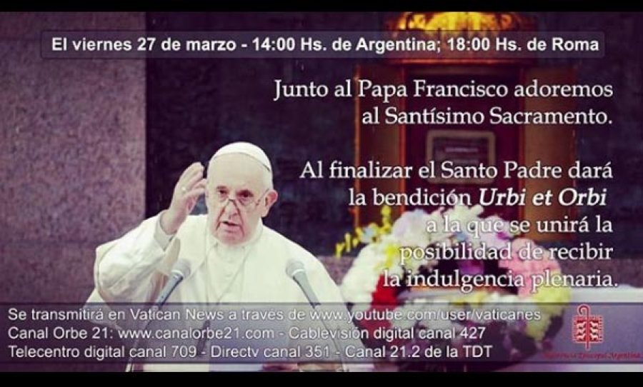 Francisco convocó a otro momento de oración para este viernes 27 de marzo, a las 18, cuando presidirá desde la Plaza de San Pedro, vacía, la escucha del Evangelio, una súplica, la adoración del Santísimo y al final impartirá una bendición "urbi et orbi", a la ciudad y al mundo, extraordinaria, en la que podrá recibirse la indulgencia plenaria.