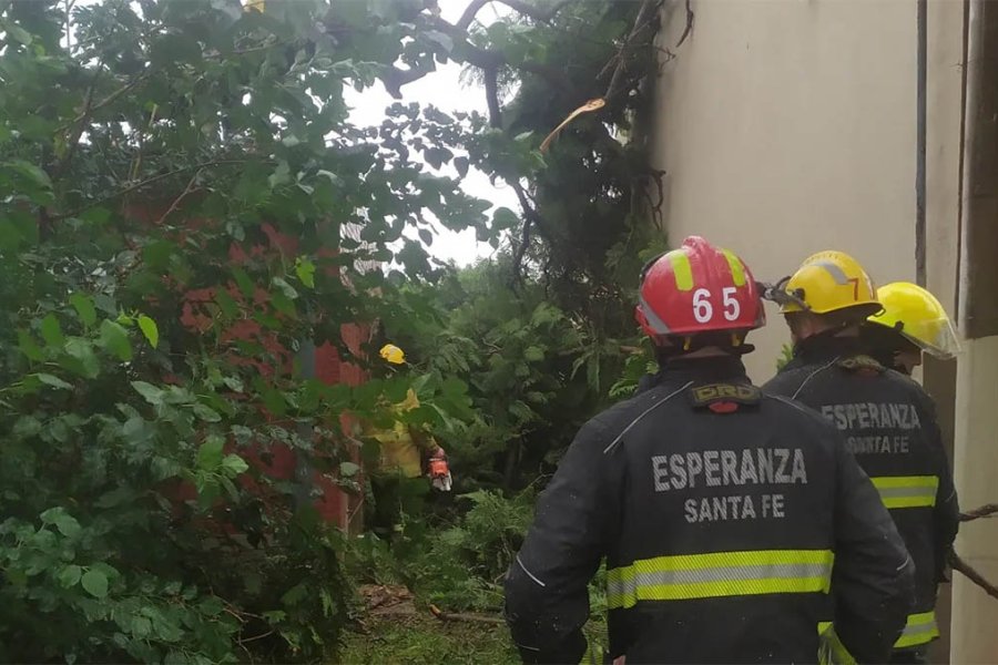 Por motivos de la tormenta se produce la caída de un árbol de gran porte sobre una vivienda, bomberos voluntarios de Esperanza trabajo para extraer y eliminar el riesgo de posible daños.