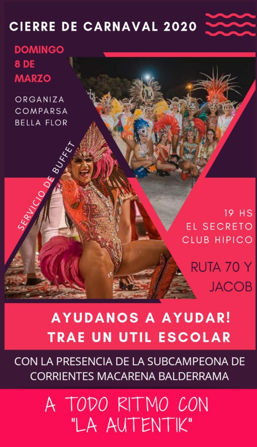 En el interior del predio ubicado al norte de ruta 70 y Jacob, se podrá colaborar con el buffet y la actividad contará con la presentación de la banda La Autentika, las comparsas Suyay, La Nueva Esperanza y Bella Flor y participará la subcampeona de Corrientes Macarena Balderrama como invitada especial.