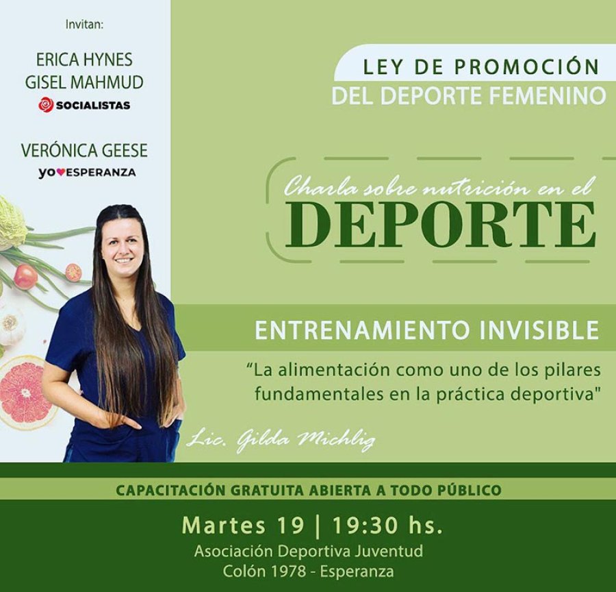 Las Diputadas Provinciales Gisel Mahmud y Érica Hynes del Partido Socialista, y Verónica Geese por YoAmoEsperanza, invitan a una capacitación sobre Nutrición en el Deporte: EL ENTRENAMIENTO INVISIBLE, a cargo de la Lic. Gilda Michlig, el martes 19 de julio a las 19,30 hs. en Asociación Deportiva Juventud, Colón 1978.