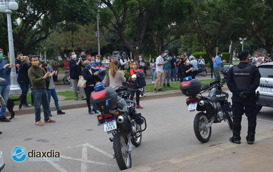 Los relatos se multiplicaban y la bronca se acumulaba. Las calles estaban cortadas frente al edificio municipal y entonces los vecinos avanzaron desde la vereda de la plaza y ocuparon ese espacio público. Ante esa pacífica avanzada mientras se batía palmas, la policía realizó un operativo que terminó con motos interrumpiendo ese paso y tres agentes (con chalecos y alcohol en gel) cuidando el ingreso al edificio.