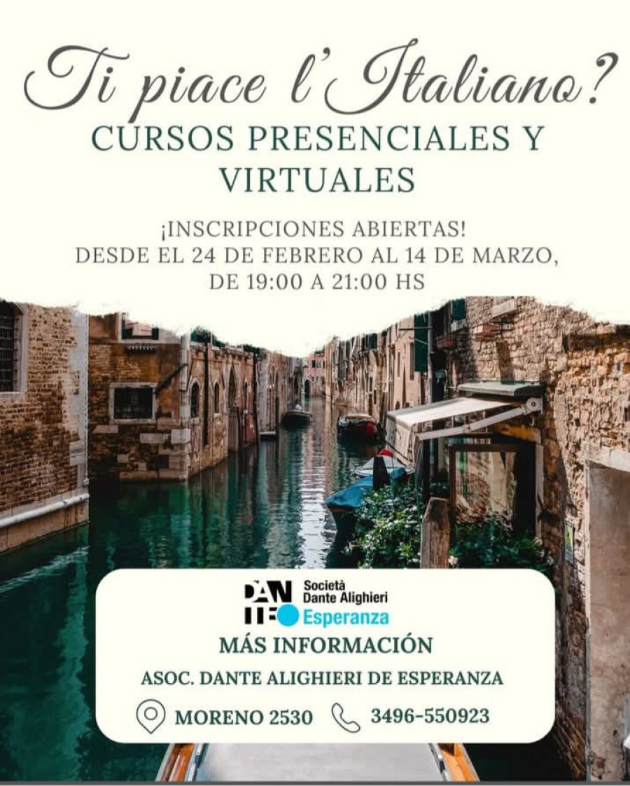 La Asociación DANTE ALIGHIERI DE ESPERANZA informa que en el Ciclo Lectivo 2025 se dictarán Cursos Sistemáticos de Idioma y Cultura Italianas (Niveles A1 a B2): para adultos, adolescentes y niños. La modalidad es presencial y a distancia.