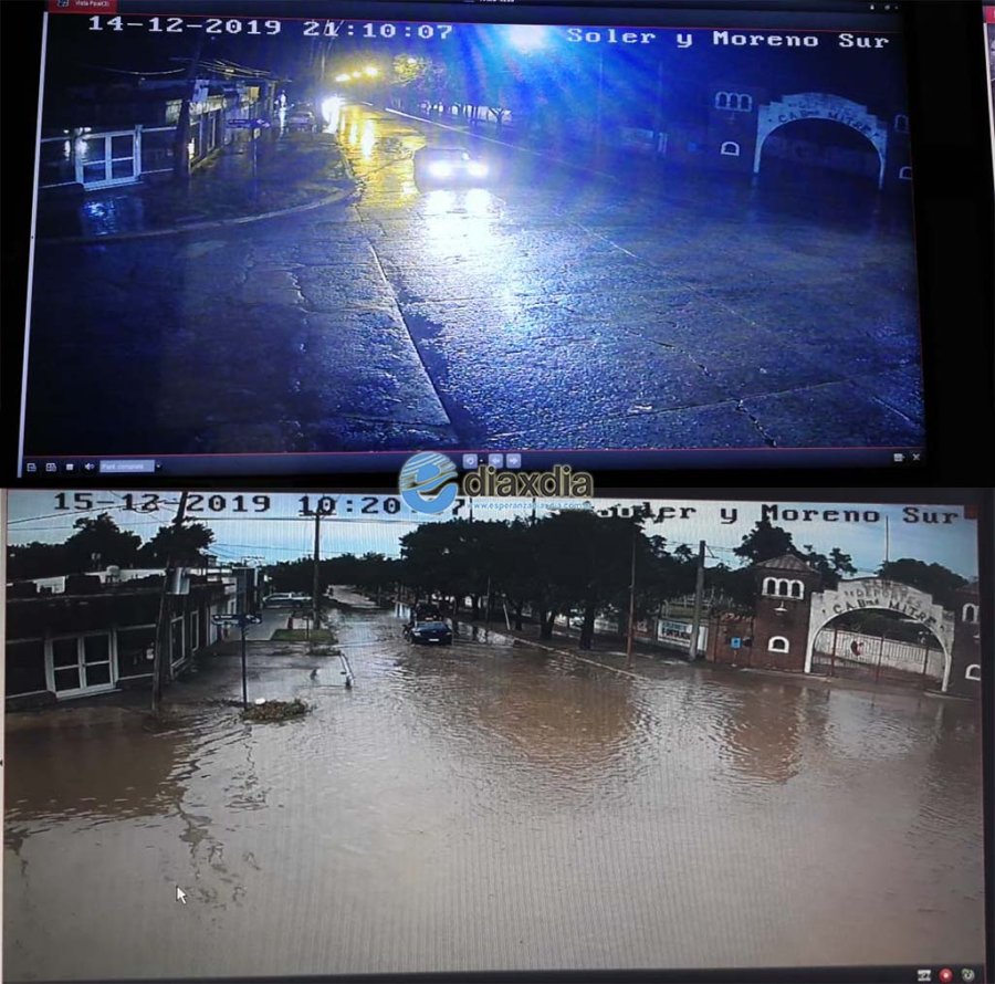 Esto puede ser claramente comprobable con este fotomontaje preparado por EDXD con imágenes cedidas desde el Centro de Monitoreo donde se puede observar la diferencia de agua acumulada en la esquina de Moreno y Soler, en el ingreso a la cancha del Club Bartolomé Mitre, donde los diferentes horarios de la toma fotográfica muestran la situación relatada.