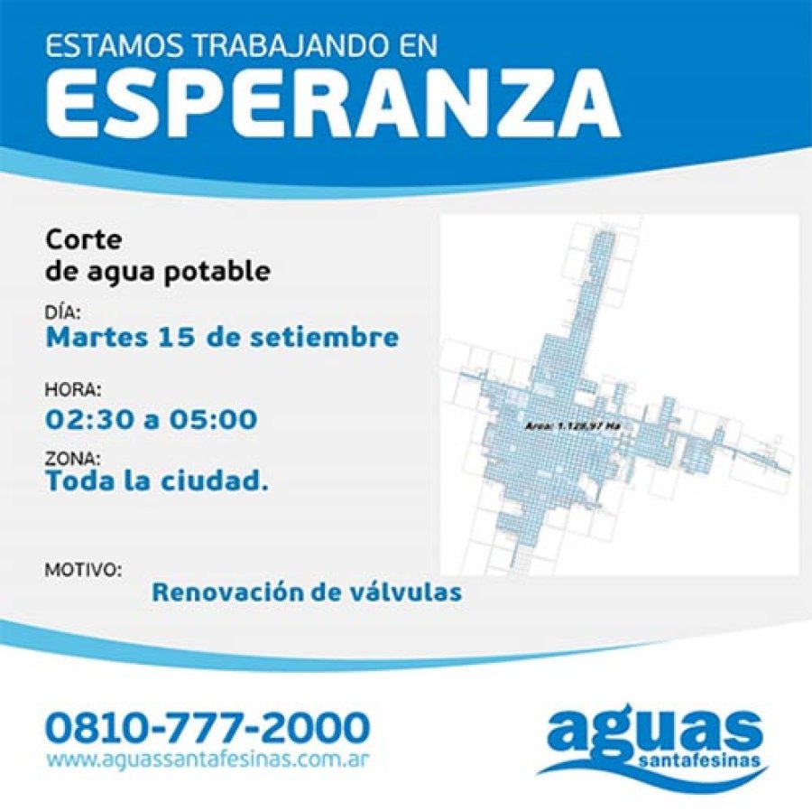 Aguas Santafesinas informa a los usuarios de la ciudad de Esperanza que el martes 15 entre las 02:30 y las 05:00 se interrumpirá la provisión de agua potable en toda la ciudad.