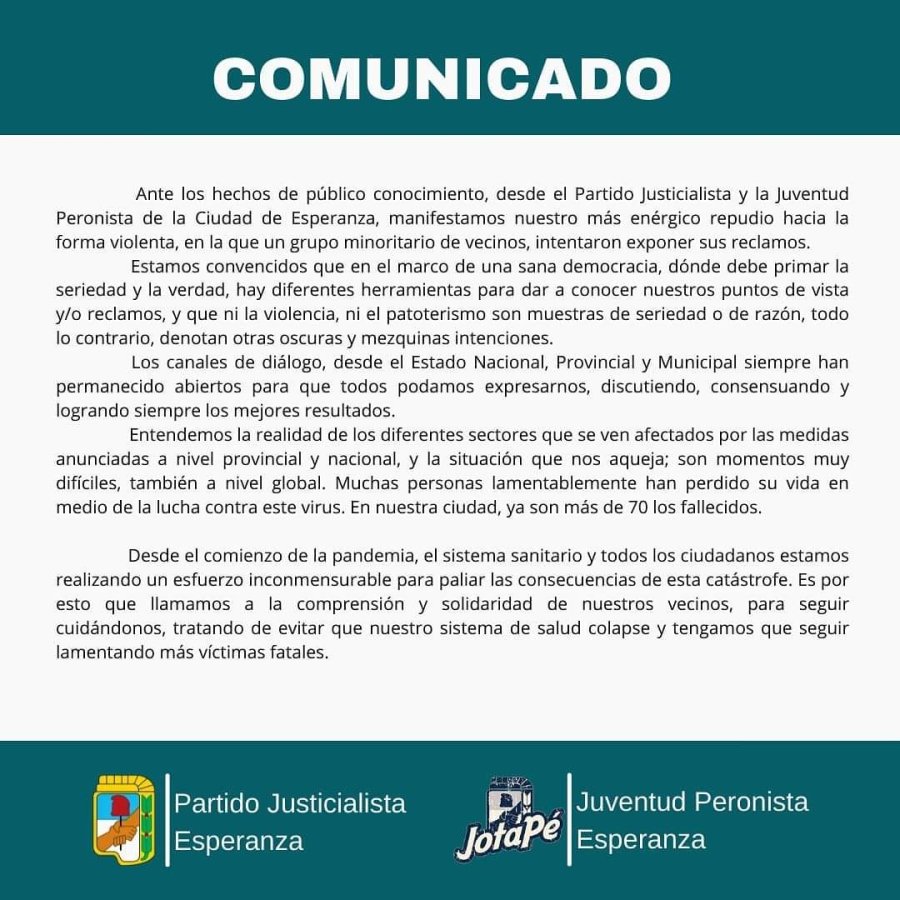 Mediante un comunicado el Partido Justicialista de Esperanza y la Juventud Peronista expresaron su rechazo a la forma en la cual "un minoritario grupo de vecinos, intentaron exponer sus reclamos".