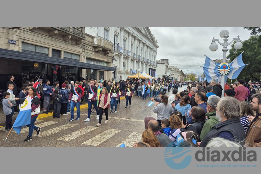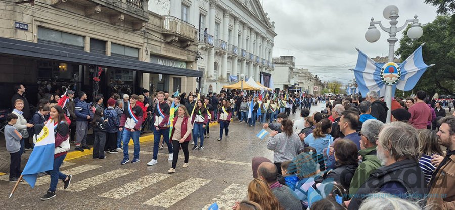 Luego con un escenario instalado en la vereda del municipio, se realizó un acto previo al inicio del desfile cívico militar. Allí el intendente se refirió a la fecha y la necesidad de trabajar en conjunto. La frase de moda, "nadie se salva solo" repitió en varias oportunidades Rodrigo Müller.