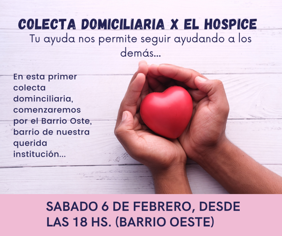 El próximo sábado 6 de Febrero la comunidad de colaboradores y voluntarios del Hospice La Piedad realizará la 1° Colecta Domiciliaria por el Hospice desde las 18 hs. En esta oportunidad comenzarán por el Barrio Oeste.
