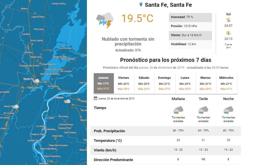 De acuerdo a la información del Servicio Meteorológico Nacional, hay altas probabilidades de que se desarrollen tormentas aisladas durante toda la jornada. Para la tarde, se prevé una máxima de 31°.