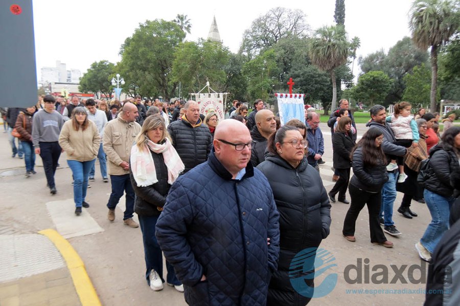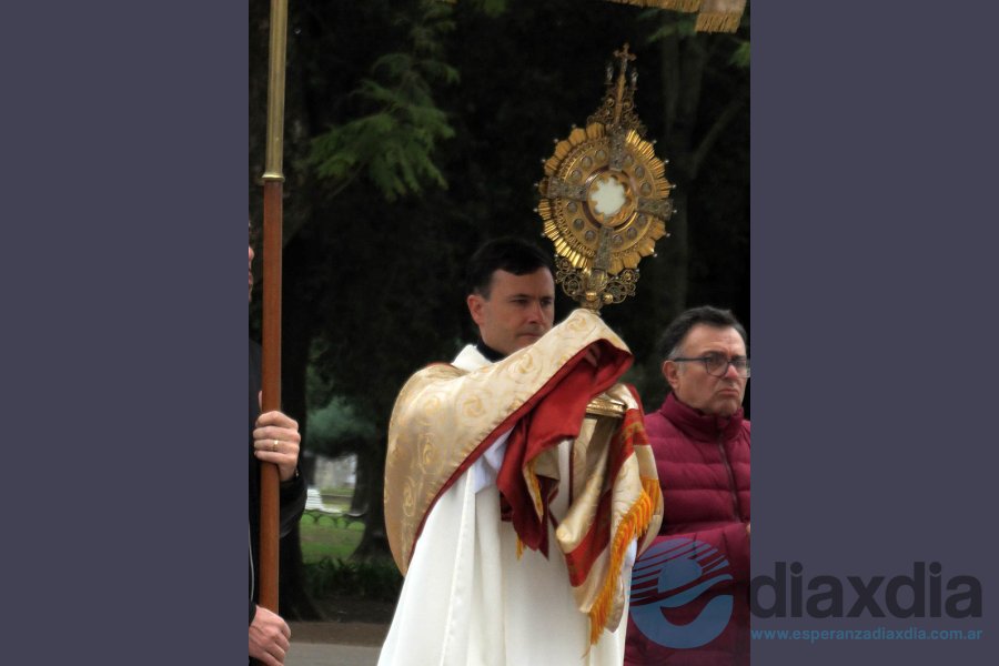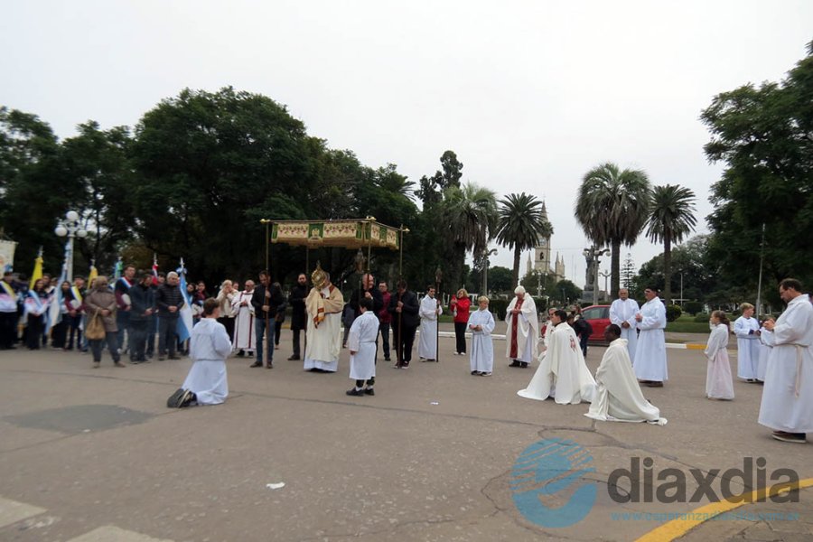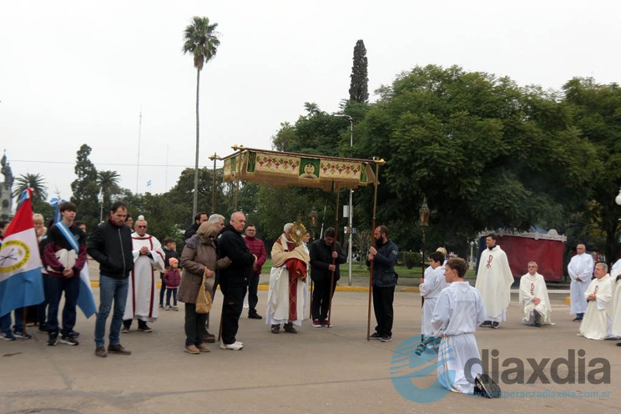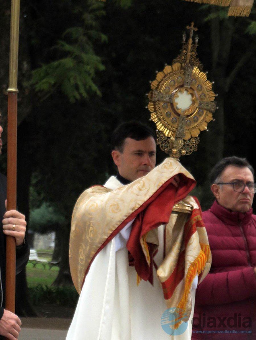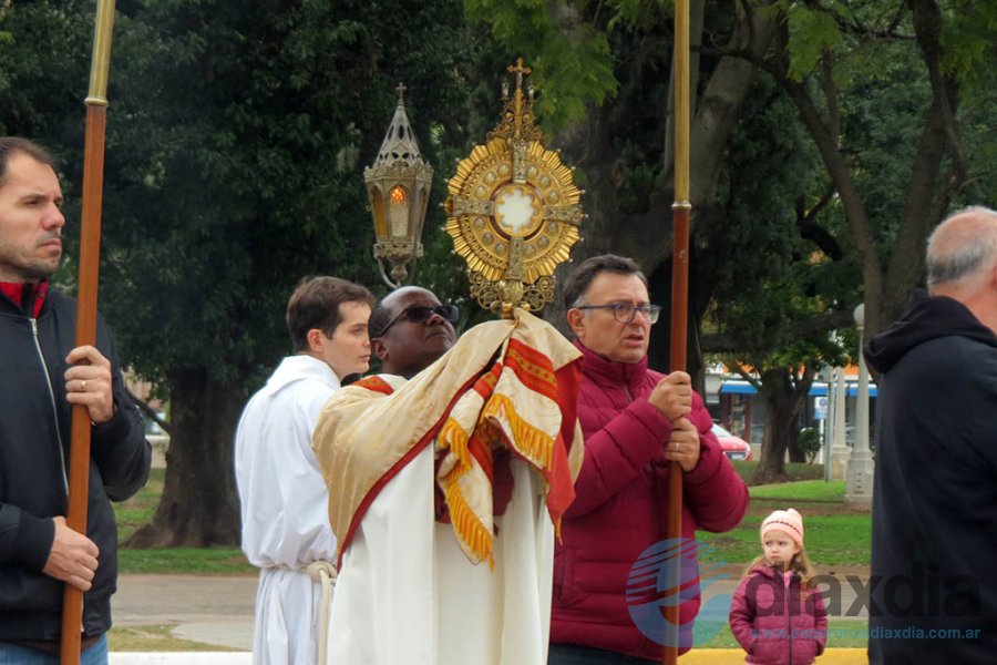 Como es tradicional los sacerdotes trasladaron el Santísimo alrededor de Plaza San Martín y se detuvieron para especiales bendiciones es los cruces con las avenidas y calle San Martín para bendecir la ciudad hacia los cuatro puntos cardinales.