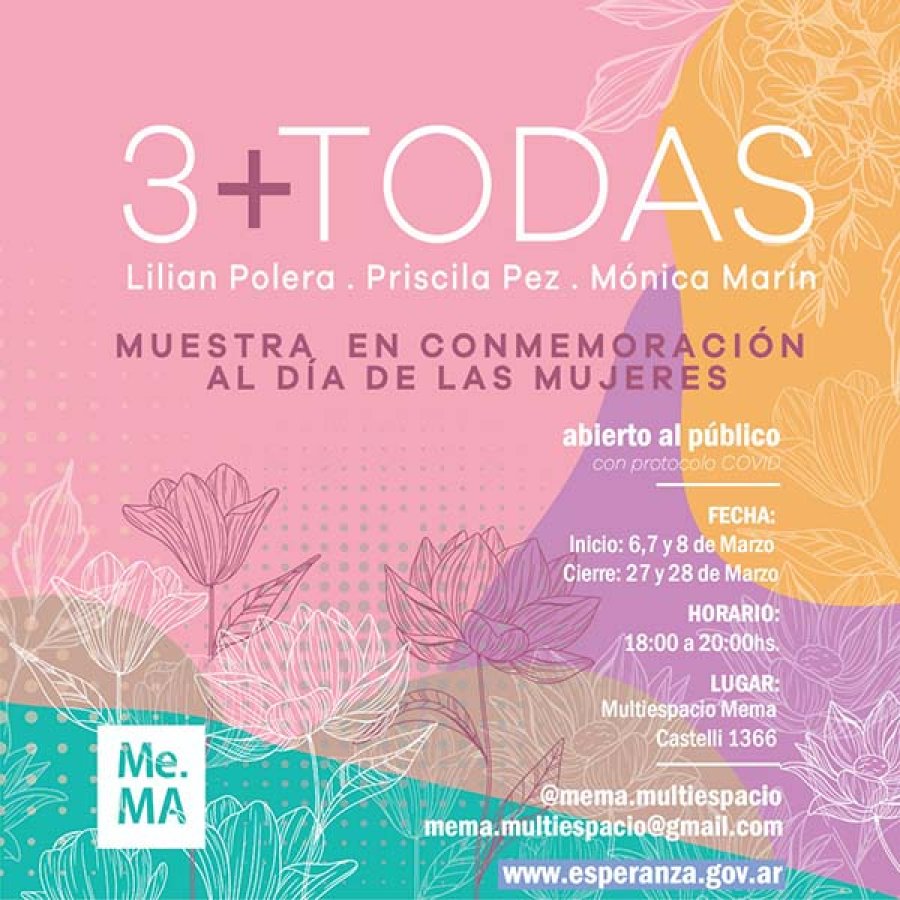 Durante este fin de semana se habilitó la muestra 3+Todas en el espacio Mema de Castelli 1.366 de Esperanza. Este lunes en conmemoración al Día Internacional de la Mujer también se podrá visitar la obra de las tres artistas en el horario de 18 a 20..
