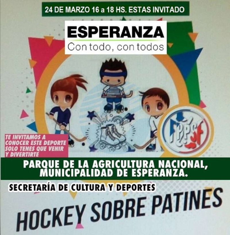 La Municipalidad de Esperanza a través de la Secretaría de Cultura y Deportes informa que, el próximo domingo -24 de marzo- a partir de las 16 y hasta las 18 horas, se llevará a cabo un muestreo de hockey obre patines en la cancha de básquet del Parque de la Agricultura.[{adj:240353 alignright}]