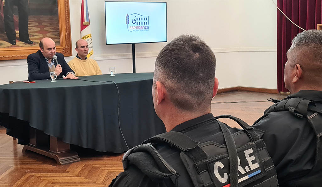 El intendente de Esperanza, Rodrigo Müller y el secretario de Control y Seguridad, César Gioria, valoraron la mejora del trabajo en el Centro de Monitoreo y destacaron un mejor vínculo con la policía local.