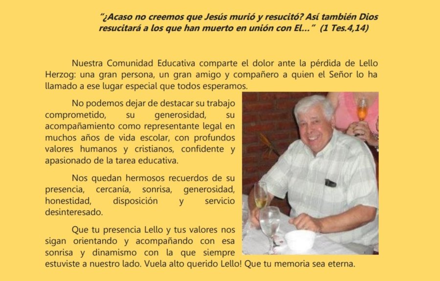 Con profundo dolor, se recibió la noticia del fallecimiento del Ing. Agr. Lello Herzog, quien fuera Decano de la ex Facultad de Agronomía y Veterinaria de Esperanza (FAVE), período 1990-1993, ocurrido hoy –martes 4 de junio- a los 76 años.