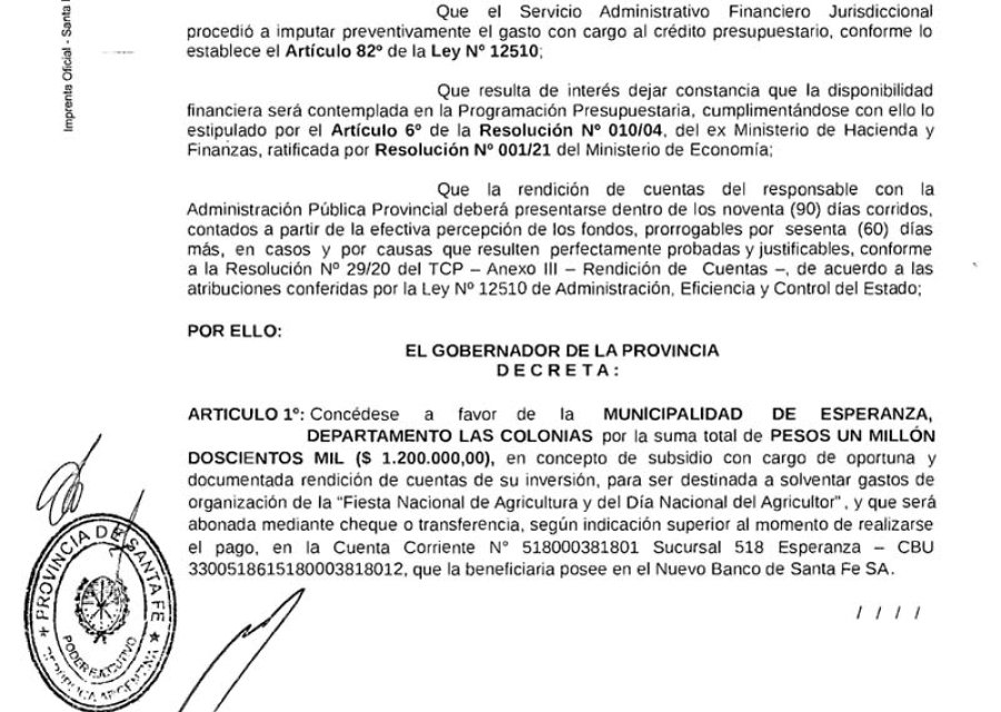 Este aporte de $ 1.200.000 llega desde el Ministerio de Gestión Pública y el decreto que lleva el número 1.685 fue firmado por el propio gobernador Omar Perotti. Se suma al anunciado aporte de $ 400.000 del Ministerio de la Producción que confirmó desde el escenario de la fiesta el secretario de Desarrollo Territorial y Arraigo, Fabricio Medina.