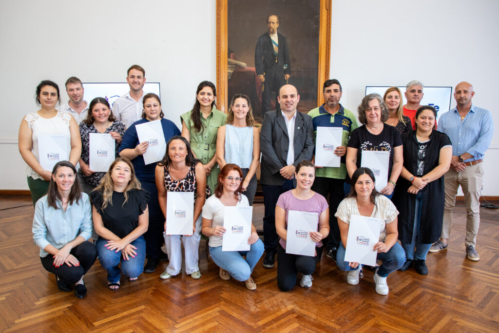 El intendente de Esperanza, Rodrigo Müller, la ministra de Igualdad y Desarrollo Humano, Victoria Tejeda y la diputada provincial, Jimena Senn, encabezaron este viernes la entrega de créditos y aportes para emprendedores y clubes de la ciudad en el Salón Blanco municipal.