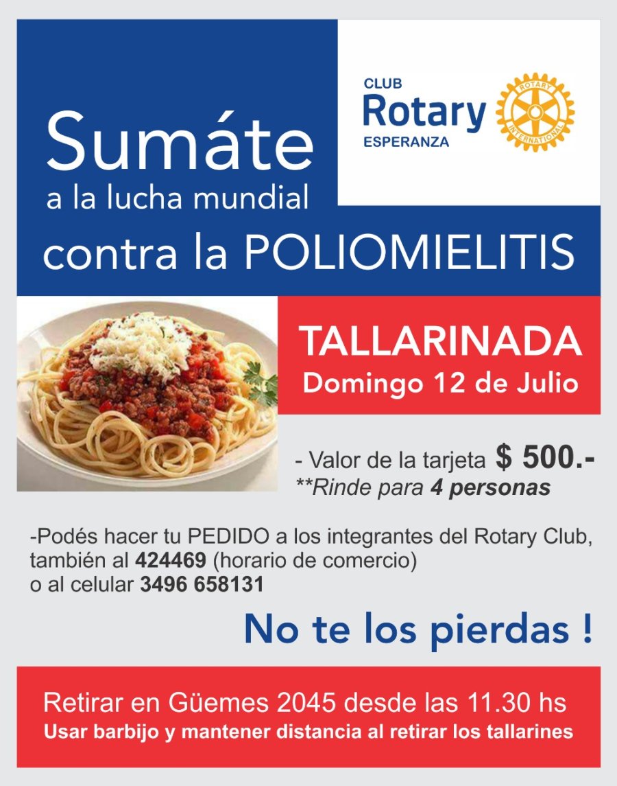El próximo domingo 12 de Julio se concretará una nueva Tallarinada Rotaria. El valor de la tarjeta es de $ 500 y puede ser retirada en Güemes 2045 desde las 11:30.