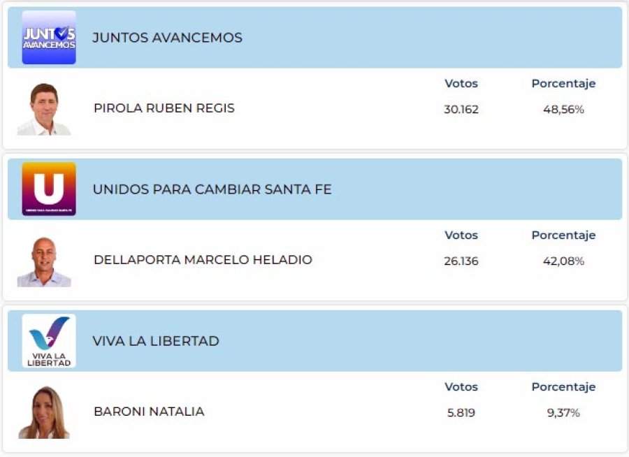 Rosario: Miguel Rabbia (Juntos). No fue por la reelección. En cambio, optó por presentarse como candidato a diputado e ingresará a la Cámara baja en diciembre próximo. El candidato que cubrió su lugar, dentro de ese espacio, Lisandro Cavatorta, perdió a manos de Ciro Seisas (Unidos).