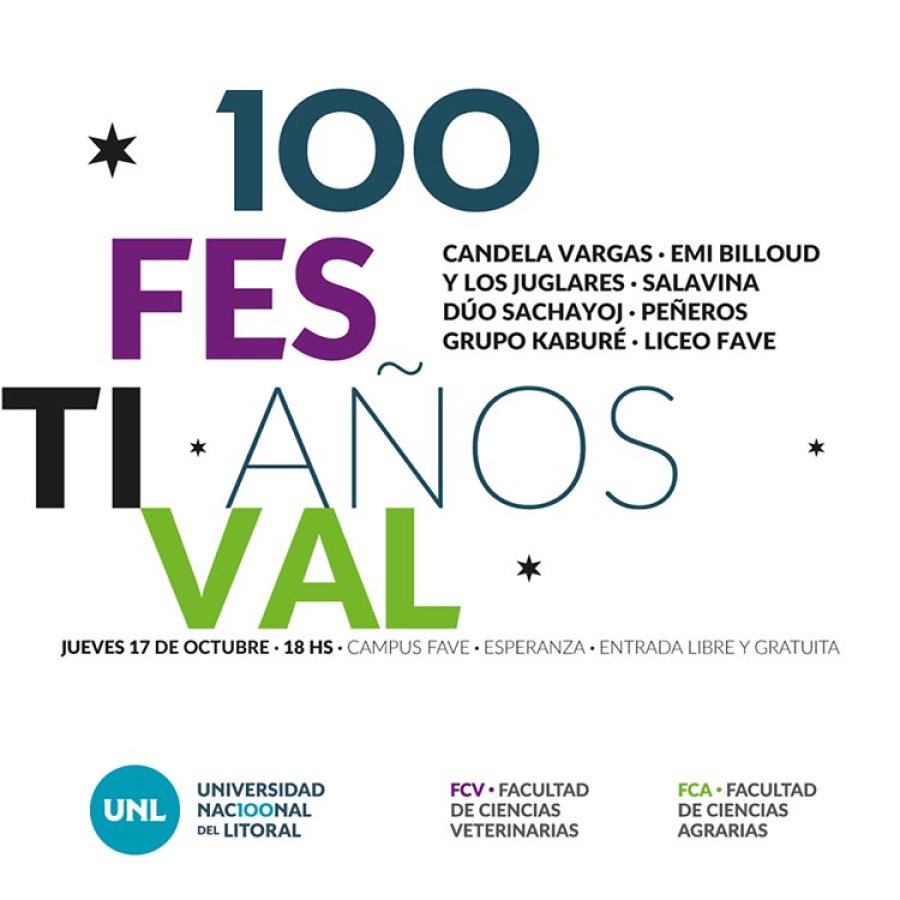 Los festejos por los 100 años de la Universidad Nacional del Litoral continúan en el Campus FAVE de Esperanza. Este jueves 17 de octubre desde las 18 hs. se realizará un Festival Folclórico que contará con la presencia de artistas, grupos locales y como invitados especiales actuarán en el escenario Candela Vargas y Emi Billoud y los Juglares. La entrada libre y gratuita.