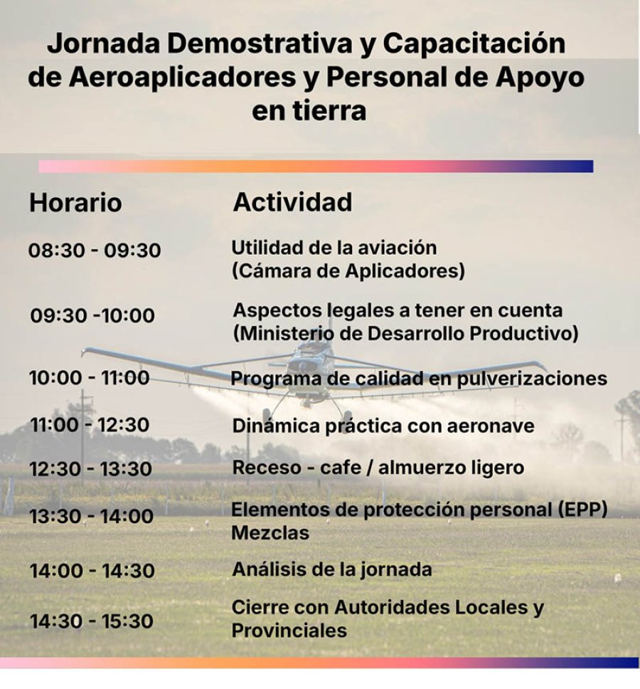 La denominada Jornada Demostrativa y de Capacitación de Aeroaplicadores y Personal de Apoyo en tierra se realizará este miércoles 3 de setiembre en el Aeroclub Ciudad de Esperanza.