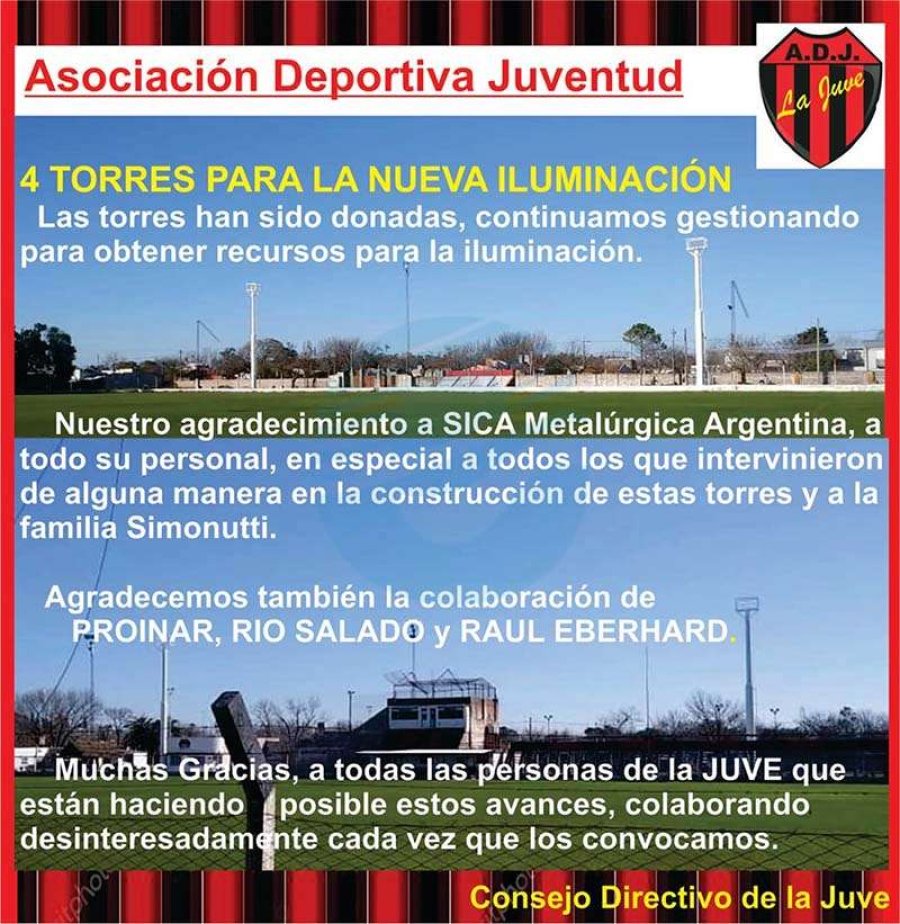 Respecto de la parte edilicia, Simonutti comentó que “este jueves se montaron las torres lo cual es un paso importante, pero si bien con la iluminación la intención es terminarlo estamos un poco demorados y expectantes de recibir algún aporte que nos ayude por los costos son muy altos”.