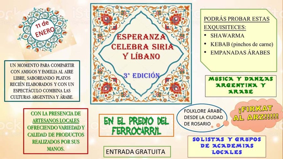 Se realizaré el 11 de enero desde las 20:30 hr en el predio del ferrocarril de Esperanza la tercera edición de Esperanza celebra Siria y Líbano.