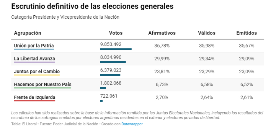 Según estos números, Sergio Massa (Unión por la Patria) obtuvo 9.853.492 votos (el 36,78% de los afirmativos), Javier Milei (La Libertad Avanza) 8.034.990 (29,99%), Patricia Bullrich (Juntos por el Cambio) 6.379.023 (23,81%), Juan Schiaretti (Hacemos por Nuestro País) 1.802.068 (6,73%) y Myriam Bregman (Frente de Izquierda y de los Trabajadores) 722.061 (2,70%).