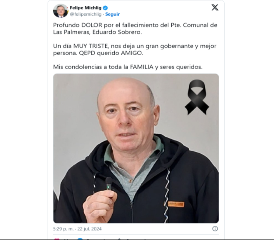 El senador nacional por San Cristóbal, Felipe Michlig, confirmó el fallecimiento de Sobrero y dejó un mensaje en sus redes.