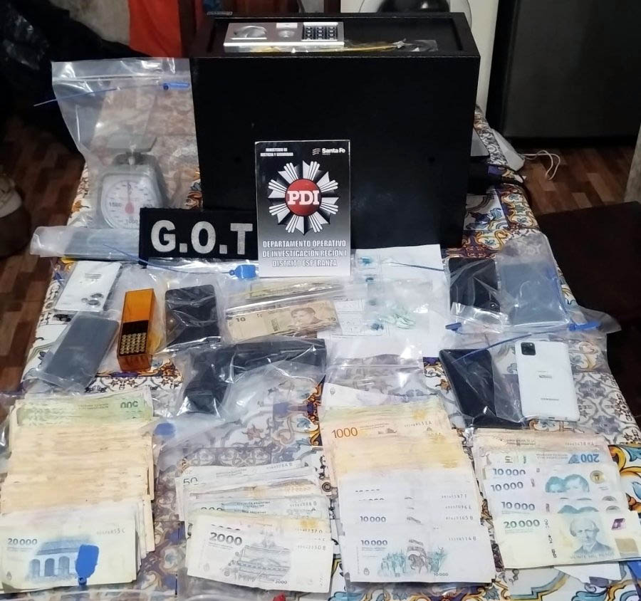 “En los domicilios allanados se secuestraron envoltorios de nylon termosellados con cocaína y una bolsa con vestigios de la misma droga”, puntualizó el fiscal. “También se secuestraron tres autos; una moto; tres armas de aire comprimido; teléfonos celulares; balanzas de precisión; una caja fuerte con llave; una réplica de arma de fuego tipo 9 milímetros; cartuchos intactos calibre 22; elementos de corte y 4.895.920 pesos en efectivo”, agregó Benítez.