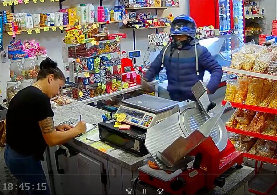 El hecho se produjo a las 18:45 y según se observa en las imágenes de la cámara de seguridad que el propietario viralizó en redes sociales, el delincuente cubierto con un casco de moto esperó que se retire una clienta y llegó amenazando con un arma a la mujer que terminaba de registrar la venta anterior.