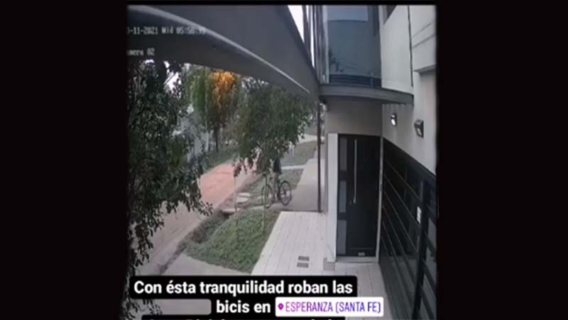 Esta vez le tocó a un joven que dejó su bicicleta SLP atada con candado dentro de un complejo de departamentos de barrio Oeste. Una cámara de una casa vecina permite ver como el ladrón se lleva la bicicleta.