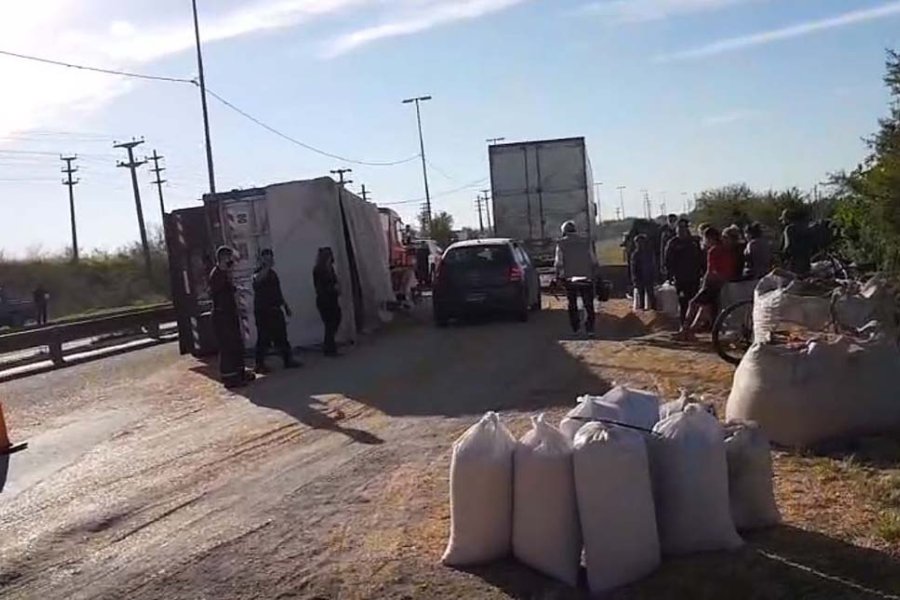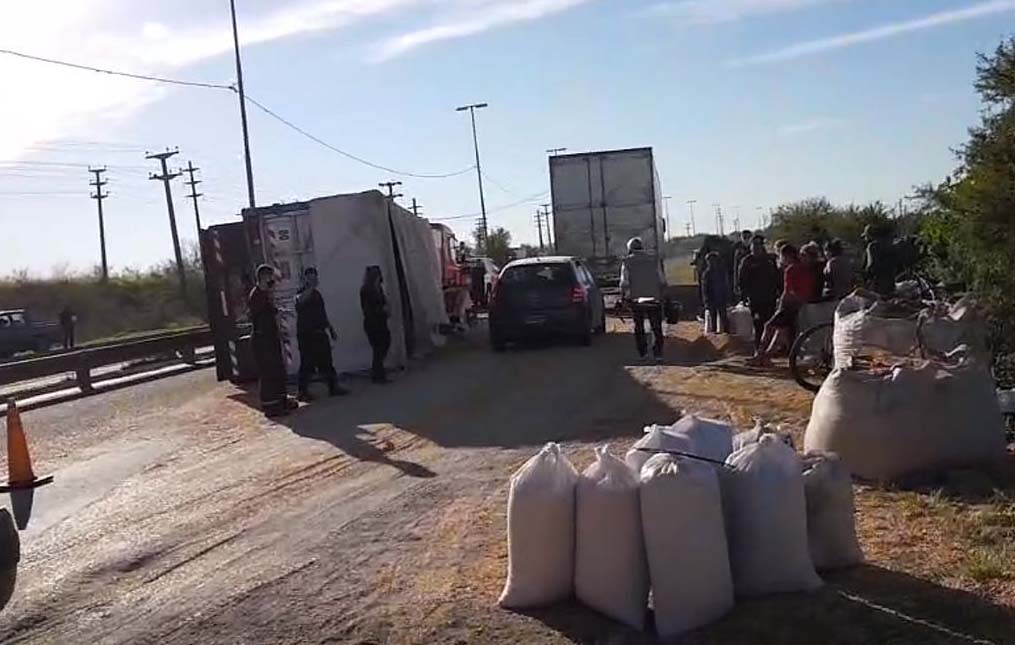 El vehículo de mayor porte hizo una maniobra para evitar colisionar con el birrodado mientras éste lo sobrepasaba, terminando volcado y con parte de la carga de granos dispersa en el asfalto.