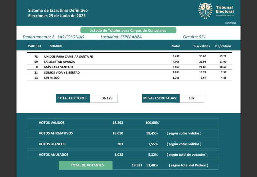 El escrutinio definitivo confirmó que la participación electoral el pasado 29 de junio, en la ciudad de Esperanza fue del 53,48%; es decir que votaron solamente 19.321 personas, de un total de 36.129 electores habilitados en el padrón.
