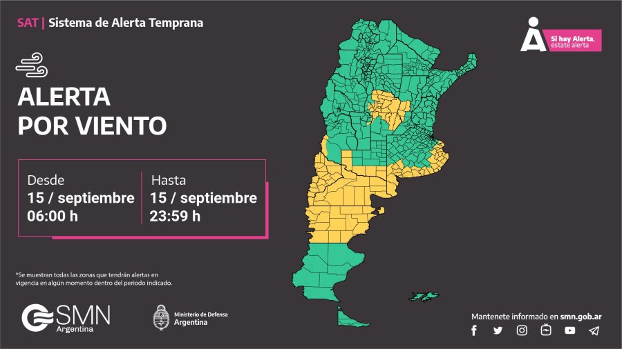 La advertencia también abarca el sudoeste de la provincia de Buenos Aires, sur de La Pampa, gran parte de Córdoba, costa bonaerense y buena parte de la Patagonia.
