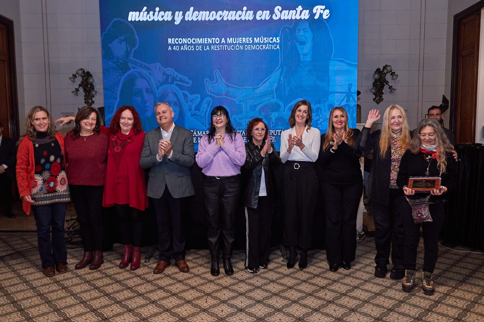 En el marco de los 40 años de democracia, por iniciativa de la diputada Erica Hynes y con la participación del presidente de la Cámara, Pablo Farías, fueron homenajeadas mujeres músicas santafesinas que fueron pioneras en la escena local durante la restitución democrática.