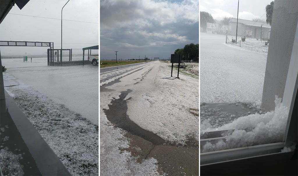 Pobladores de Sarmiento no demoraron en compartir por redes sociales imágenes del fenómeno meteorológico que los impactó primero con granizo en seco y luego con granizo en lluvia de intensidad.