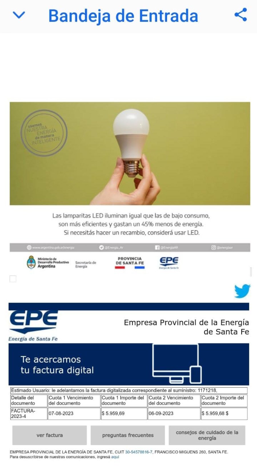 La EPE solicita no hacer clic en el enlace "descargar factura" que figura en el correo electrónico apócrifo y cualquier duda, viabilizarla por los canales habituales de comunicación: www.epe.santafe.gov.ar/oficina-virtual.
