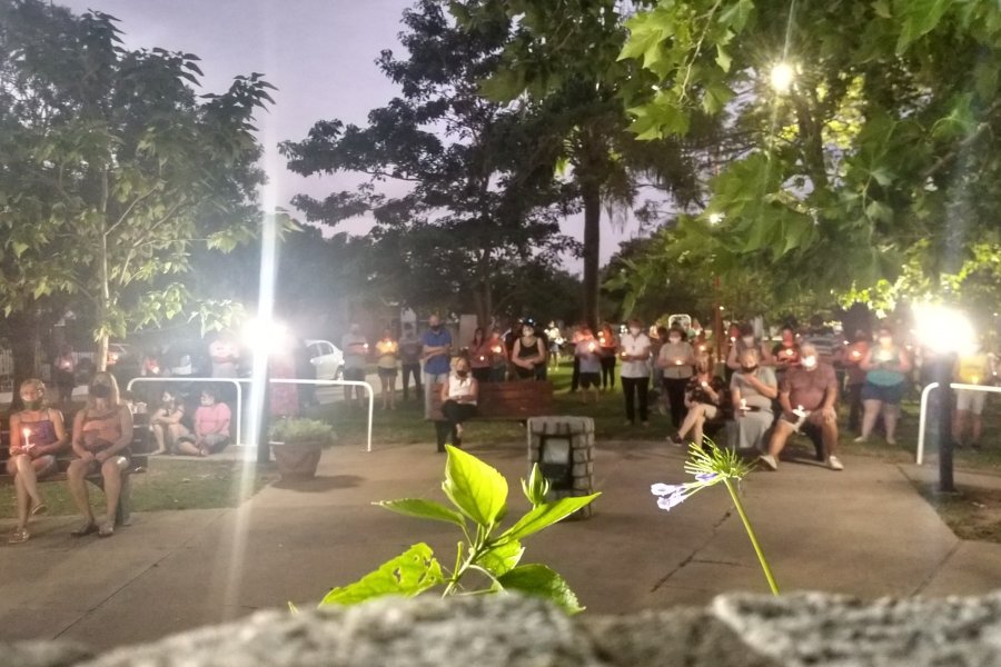 Todo comenzó con una intervención artística en calle Sarmiento, entre 25 de mayo y Avenida Beck y Herzog y luego una importante cantidad de vecinos se concentraron frente a la imagen de la Virgen María en el ingreso a la localidad para rezar y recordar a Noelia Oschstadt.