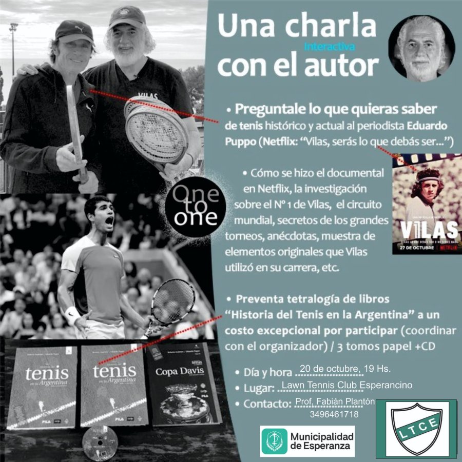 La charla se realizará bajo el slogan de “pregúntale lo que quieras sobre el tenis histórico y actual a Eduardo Puppo”. El periodista llevó a cabo toda la investigación para luego hacerse la película - documental “Vilas serás lo que debas ser o no serás nada”, original de Nexflix, que se estrenó en el año 2020, para más de 190 países en simultáneo.