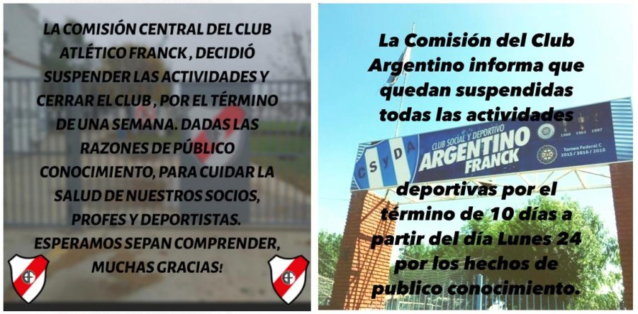 Atlético Franck informó que las actividades fueron suspendidas por una semana y Argentino de Franck por diez días.