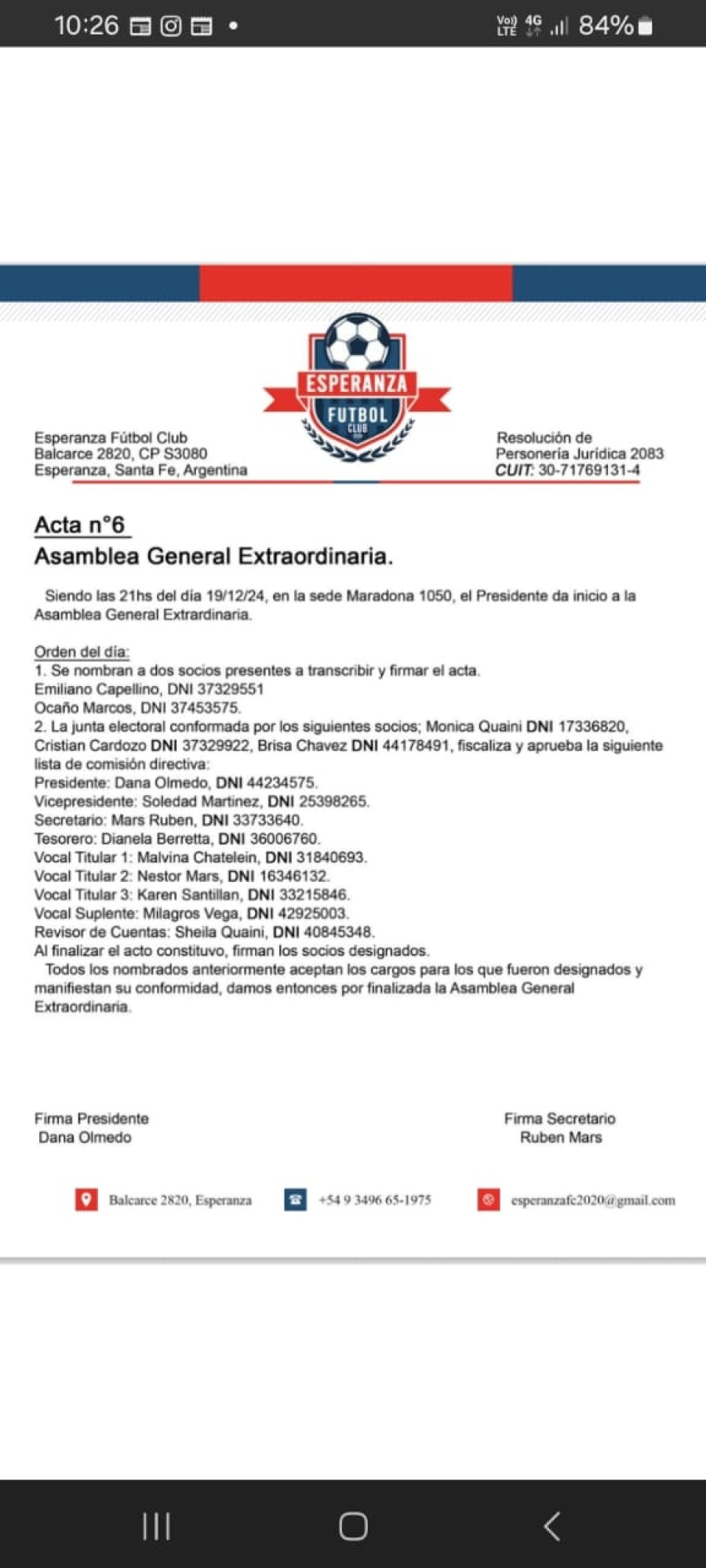 Se realizó la Asamble General Ordinaria del Esperanza Fútbol Club, la misma tuvo lugar en la sede social Maradona 1050, con el siguiente orden del día: