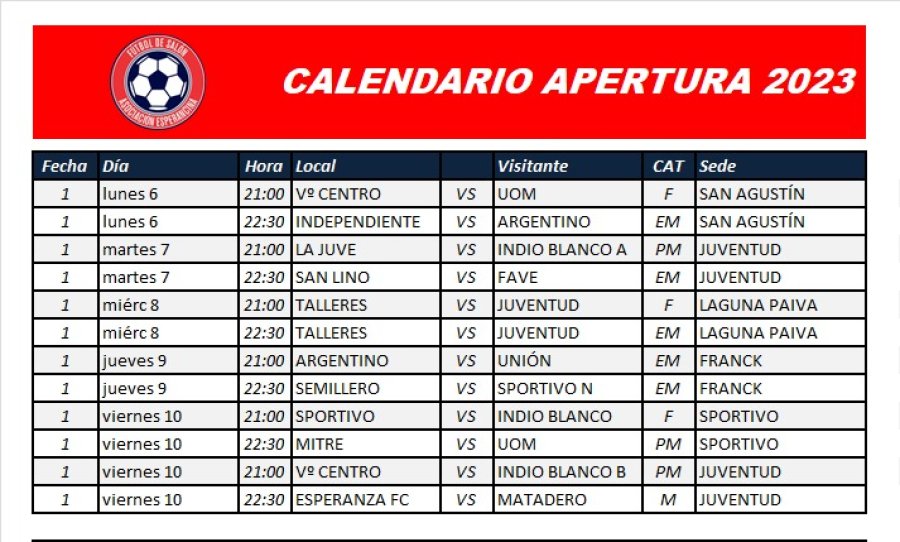 La Asociación Esperancina de Fútbol de Salón dio a conocer las las sedes y horarios de las 5 primeras fechas para sus categorías Femenino, Elite Masculino y Primera A Masculino.