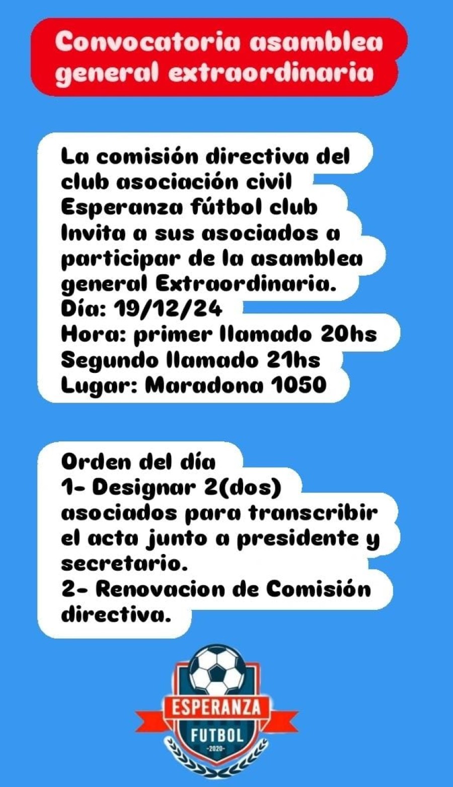 Se convoca a todos los asociados del Club Asociación Civil Esperanza Fútbol Club a la Asamblea General Extraordinaria para el día 19 de diciembre a las 20 horas con el primer llamado y para las 21 horas el segundo llamado.