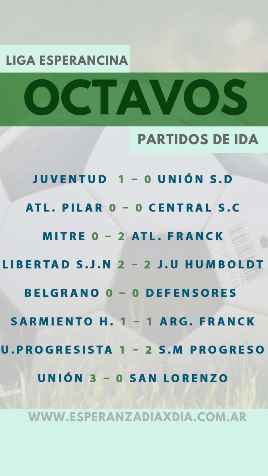 Atlético Franck y San Martín de Progreso fueron los únicos que ganaron como visitantes en la serie de ida de los octavos. Como locales ganaron Unión y Juventud de Esperanza. Por la Supercopa ganaron los locales.